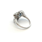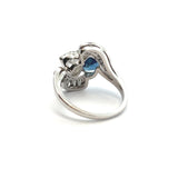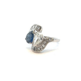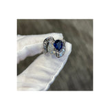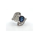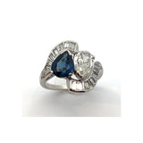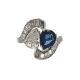 A ring set with a pear-shaped diamond and sapphire accented by baguette-cut diamonds.