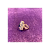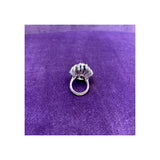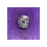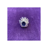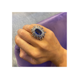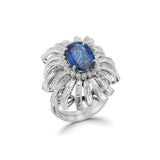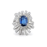 Sapphire & Diamond Cocktail Ring, A platinum and white gold ring set with a central oval sapphire with a halo of round diamonds and 21 rows of baguette diamonds extending outward