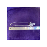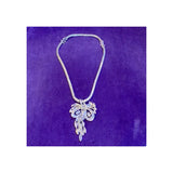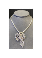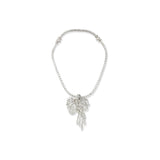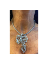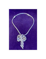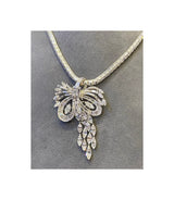 A tennis necklace featuring baguette & round cut diamonds & two diamond bow motif clasps. The pendant set with baguette & marquise diamonds is removable as a brooch.