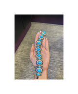 A karat rose gold bracelet made of links set with a center cabochon turquoise framed by round cut diamonds and sapphires separated by smaller links set with a smaller cabochon turquoise and round cut emeralds