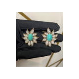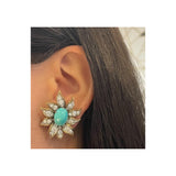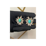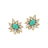 The floral earrings are adorned with sugarloaf turquoise and round diamonds.