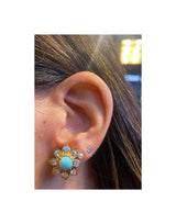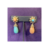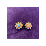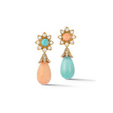 A pair of earrings with flower motif daytime elements, one set with a cabochon turquoise and the other set with a cabochon coral, each framed by round cut diamonds. The detachable nighttime elements feature mismatched coral and turquoise drops, accented by round and single cut diamonds.