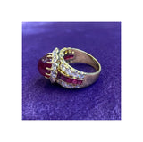 Featuring a center cabochon ruby encircled by round-cut diamonds, set with a series of square-cut rubies and graduated round cut diamonds.