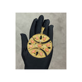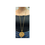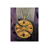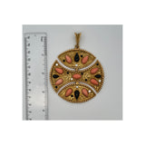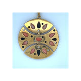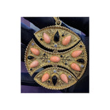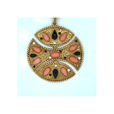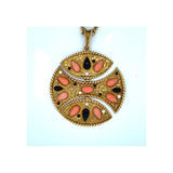 A pendant necklace by Van Cleef and Arpels, circa 1970s, with a large circular-shaped textured gold pendant, composed of three hinged sections, decorated with pear-shaped cabochon coral and black onyx, further accented by round cut diamonds.