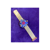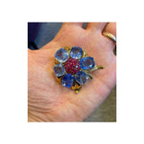 Six cushion cut sapphires surrounding round cut rubies all set in 18k yellow gold forming a flower.