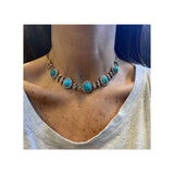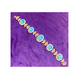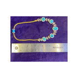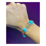 Cabochon turquoise designed as a series of 5 oval graduated clusters with 2 leaf motif intersections, consisting of round cut diamonds & a chevron link chain. Converts into a bracelet.