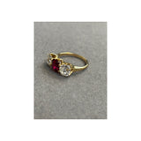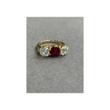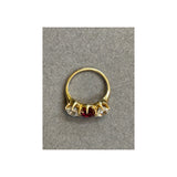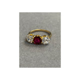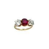 A yellow gold ring centering a round-cut ruby flanked by two old mine cut diamonds.