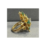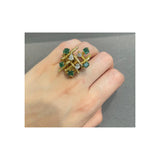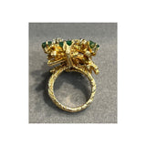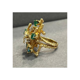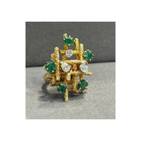 A Brutalist style yellow gold ring set with square cut emeralds and a pear shape, oval and round cut diamond.