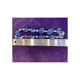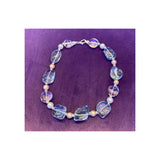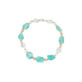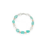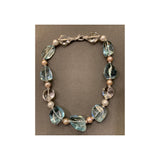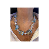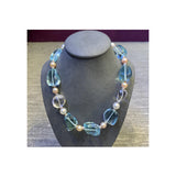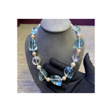 A necklace featuring large aquamarine beads, rock crystals beads, and pink and white pearls.