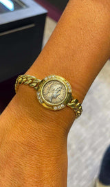 18k link, with an antique Roman sliver coin, surrounded by brilliant cut diamonds, engraved on the back of the coin "Impero Romano Commodo 175.192 AD"