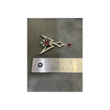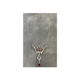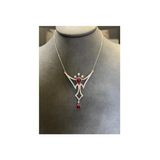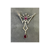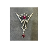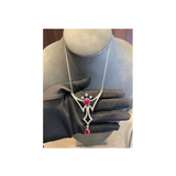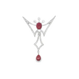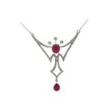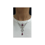A necklace with a pendant set with two cabochon rubies & round cut diamonds. The pendant is removable & can be worn as a brooch.