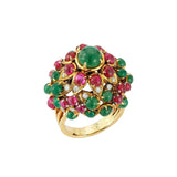 A dome ring featuring a center cabochon emerald surrounded by small cabochon rubies, emeralds & round cut diamonds.