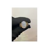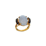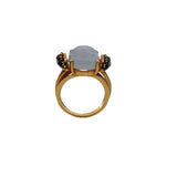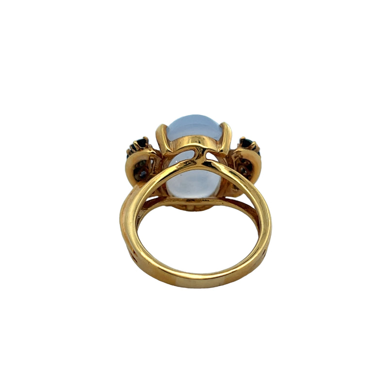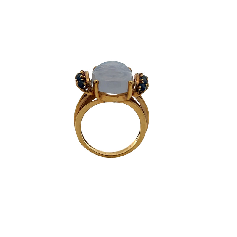 A yellow gold ring set with a carved moonstone face accented with 8 sapphires