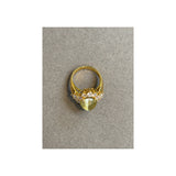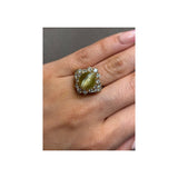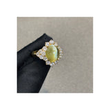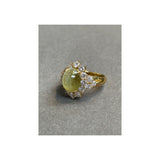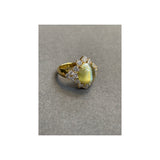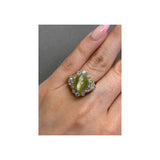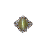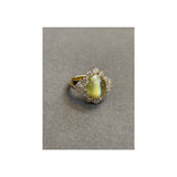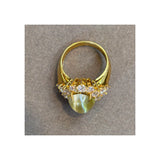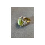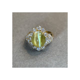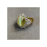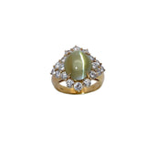 A yellow gold ring set with a cat's eye accented by 18 round cut diamonds