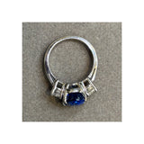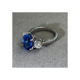 A platinum ring centering an oval cut sapphire, flanked by a round cut diamond on each side.