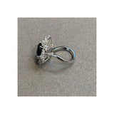 A white gold ring centering an oval cut sapphire, surrounded by marquise cut diamonds.
