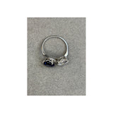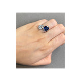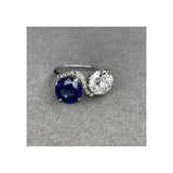 A "You and Me" ring set with a GIA certified round cut diamond and an AGL certified sapphire, accented by round cut diamonds.