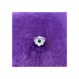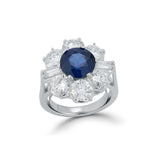A platinum ring set with a central round cut heated sapphire framed by 6 European & 2 baguette diamonds in the shape of a flower