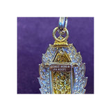 Set with a oval-cut Ceylon sapphire at its center, encircled by round cut white and fancy yellow diamonds.