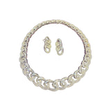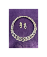 A matching necklace and earring set with round & baguette cut diamonds set in 18k white gold.