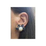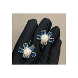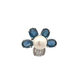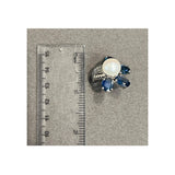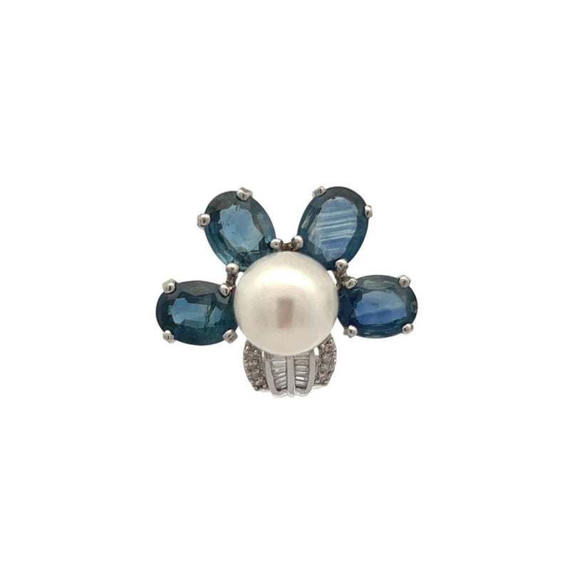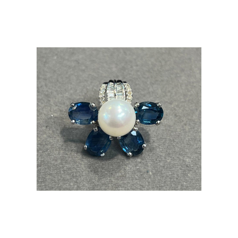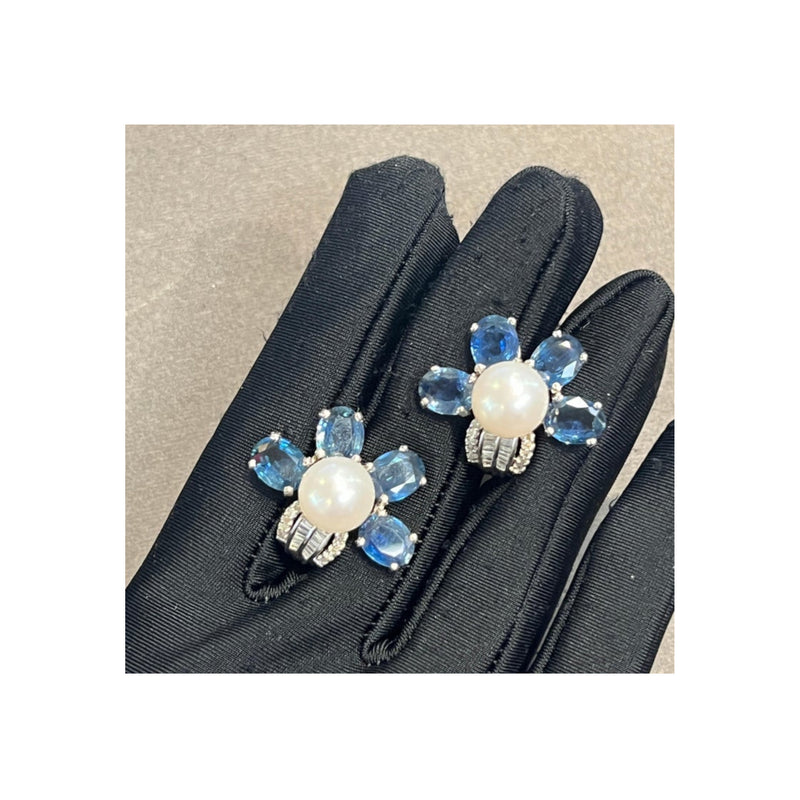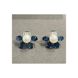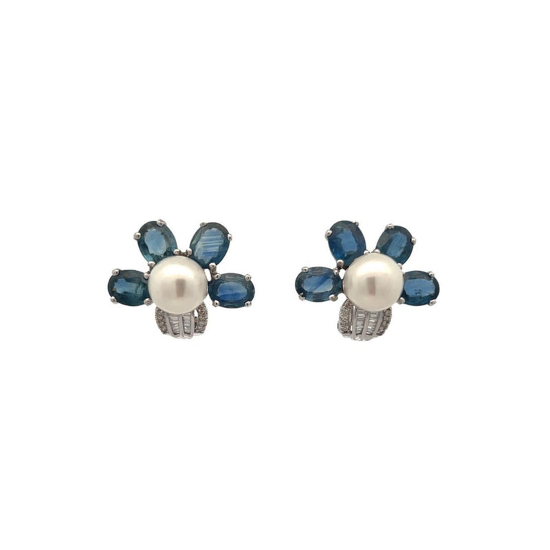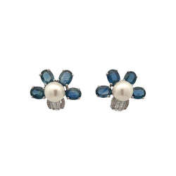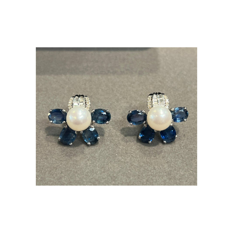 A pair of white gold floral motif earrings set with cultured pearls and oval-cut sapphires