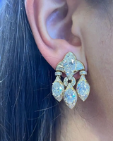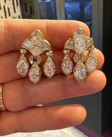 Spectacular earrings featuring a fringe design. Surrounding the oval diamonds are round-cut & tapered baguette diamonds.