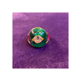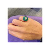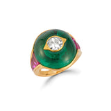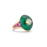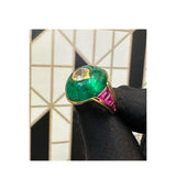 An 18 karat yellow gold ring set with a central round cut diamond set inside a cabochon emerald flanked by 6 buff top rubies