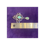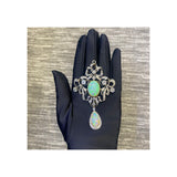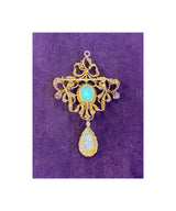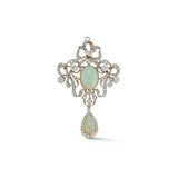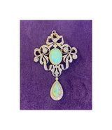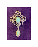 1 center opal surrounded by 5 large old mine diamonds & 91 small round cut diamonds, suspending a pear shape cabochon opal set with round cut diamonds