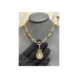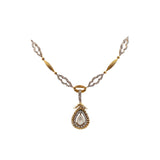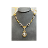 A necklace set with round-cut diamonds on a link chain and a pendant with a pear-shaped pearl drop.