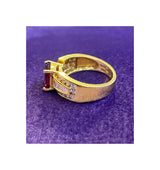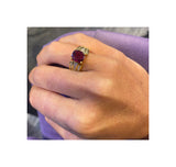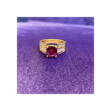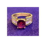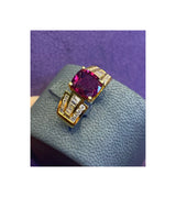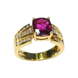 An 18 karat yellow gold ring set with a cushion cut ruby, 10 baguette cut diamonds, and 18 round cut diamonds