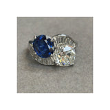 A "You and Me" ring set with a GIA certified cushion cut diamond and an AGL certified sapphire, accented by 12 baguette cut diamonds.