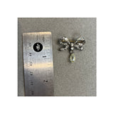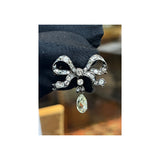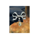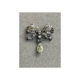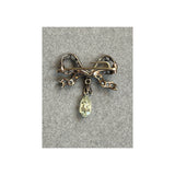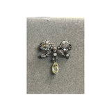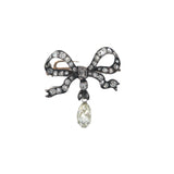 A bow brooch set with 37 old mine diamonds and one dangling briolette diamond.